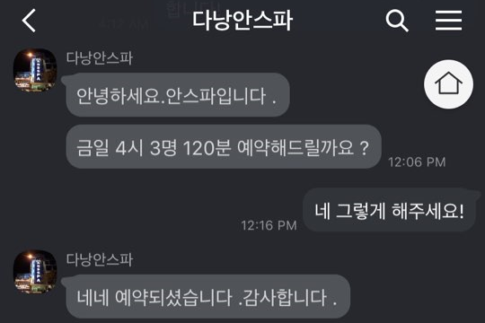오늘도 4시에 예약을 해서 딱 피곤할 타이밍에 마사지를 받게 되어 기대를 하고 갔죠. 오늘도 역시 미리 카카오톡으로 예약을 했습니다. 친절한 블로거님들 덕분에 카카오톡 아이디를 찾아서 바로 친추를 했습니다. 카톡 아이디는 '다낭안스파'라고 찾으면 나오더군요 (아니면 밑에 사진에도 영어로 된 아뒤도 나와 있어요^^). 그래서 친추를 하면