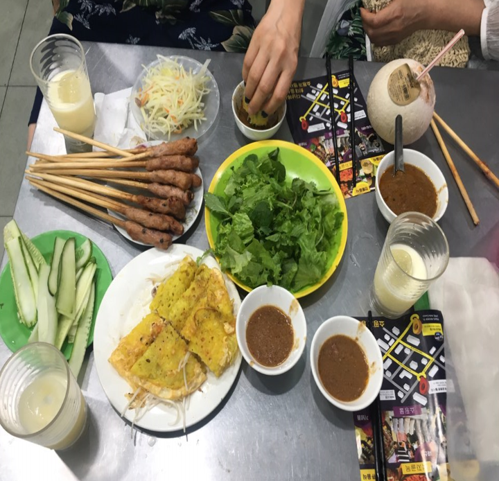 테이블에 앉으면 일단 주문 없이 밑에 사진과 같이 인원수대로 음식을 갖다 줍니다. 반쎄오만 파는 맛집인 것 같아요. 음료만 추가로 주문하시면 됩니다. 저희는 옥수수 음료와 코코넛 주스를 시켰어요. 혹시 야채나 떡갈비 꼬치(넴)가 떨어지면 추가 비용을 내고 더 시키면 됩니다.